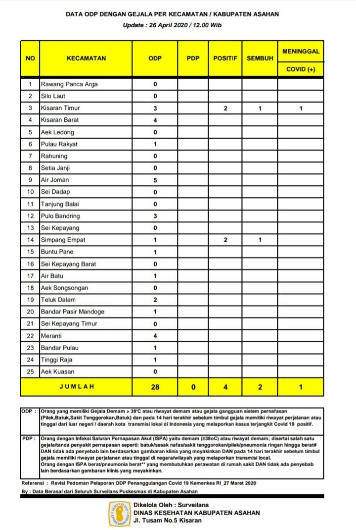 Dimana Data Update ini berdasarkan hasil data surveilans dari seluruh Puskesmas yang ada di wilayah Kabupaten Asahan, yang di kelola Dinas Kesehatan Kabupaten Asahan pertanggal 26 April 2020.