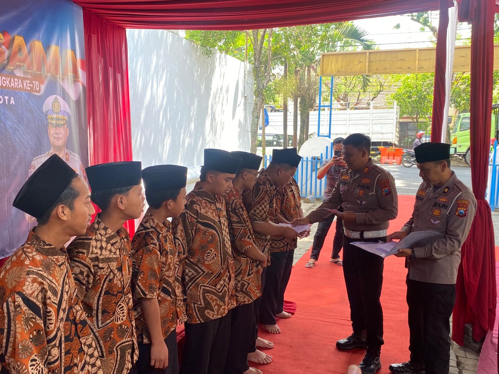 “Jadi kita melaksanakan kegiatan ini dalam rangka Hari Lalu Lintas Bhayangkara ke-70. Khususnya di Polresta Malang Kota, kita bersinergi dengan para tokoh agama, tokoh masyarakat termasuk doa bersama anak yatim piatu. Upaya kami dalam mengamankan Kota Malang dilakukan bersama para ulama,” ujarnya.