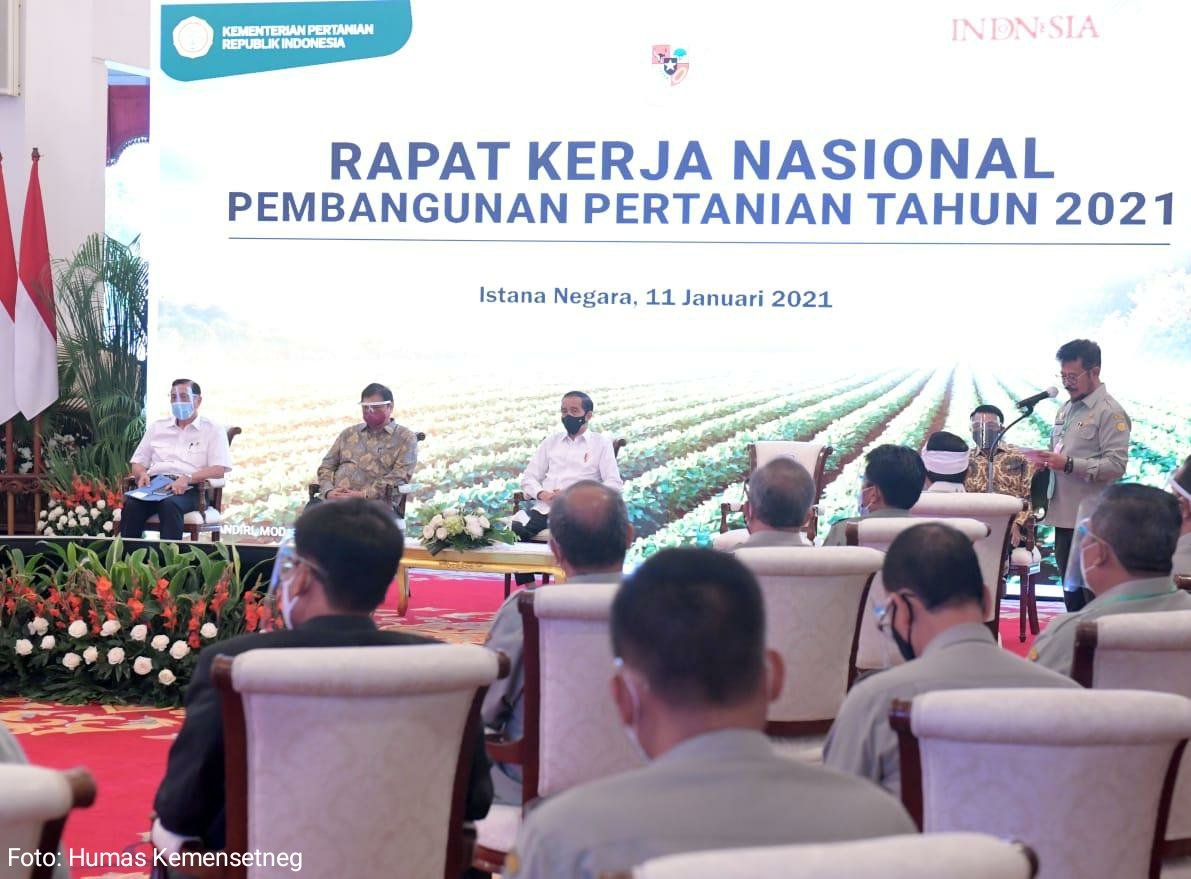 Hal itu disampaikan Presiden Joko Widodo saat meresmikan pembukaan Rapat Kerja Nasional Pembangunan Pertanian Tahun 2021 yang digelar di Istana Negara, Jakarta, pada Senin, (11/1/2021).