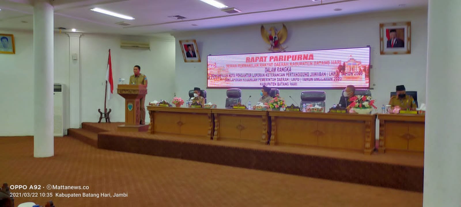 MATTANEWS.CO, BATANGHARI – Dewan Perwakilan Rakyat Daerah (DPRD) Kabupaten Batanghari Gelar Paripurna “Penyampaian Nota Pengantar Laporan Keterangan Pertanggung Jawaban (LKPJ) Tahun 2020 Dan Laporan Keuangan Pemerintah Daerah (LKPD) Tahun Anggaran 2020 Kabupaten Batanghari.
