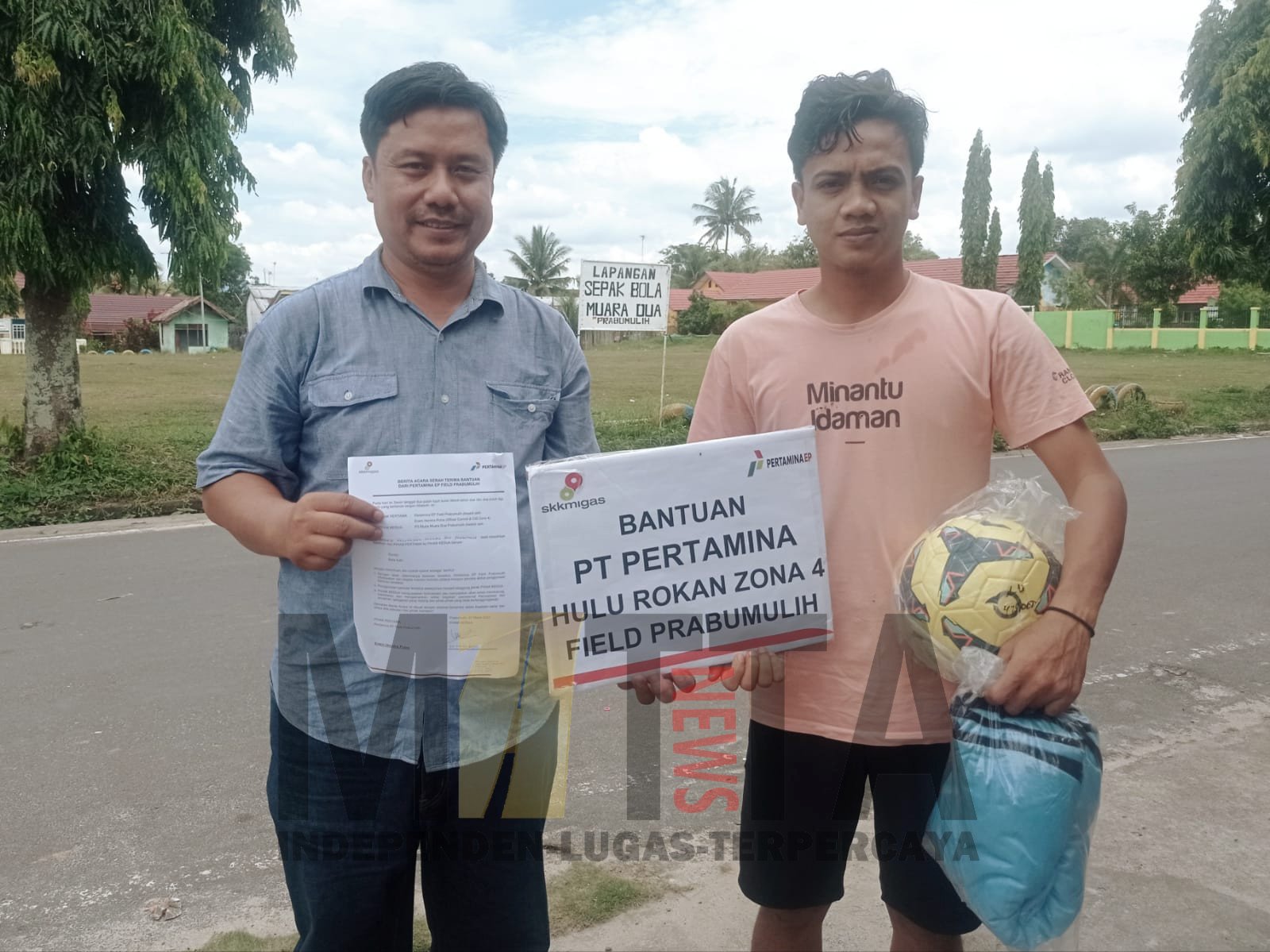 Bantuan dari PHRZ 4 Field Prabumulih diterima Ketua KT Sapad Jaya sekaligus Kapten kesebelasan PS. MUDA, Vio Marsel Alfian (VMA) di Lapangan Sepak Bola Muara Dua Kota Prabumulih, Senin (27/3/2023).