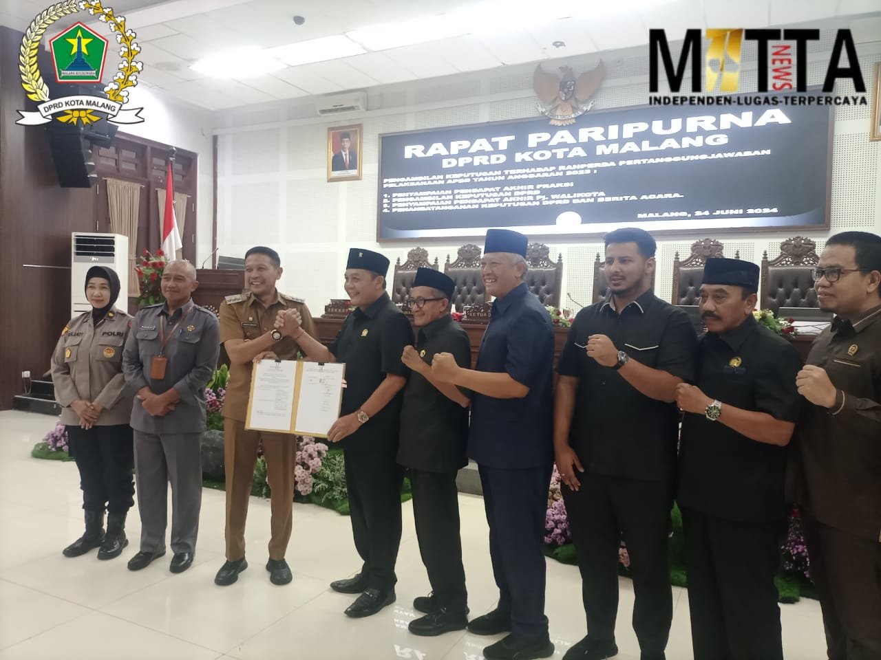 MATTANEWS.CO, KOTA MALANG – Rapat Paripurna DPRD Kota Malang terkait pengambilan keputusan terhadap ranperda pertanggungjawaban pelaksanaan APBD Tahun Anggaran 2023, meliputi penyampaian pendapat akhir fraksi, pengambilan keputusan DPRD Kota Malang, penyampaian pendapat akhir Pj Walikota dan penandatangan keputusan DPRD Kota Malang, berlangsung di Gedung Paripurna DPRD Kota Malang, Senin (24/6/2024).