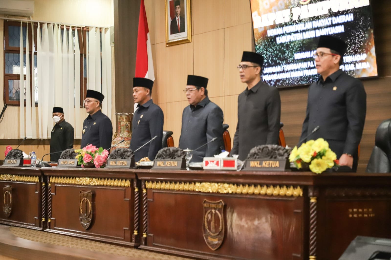 Rapat yang diselenggarakan di Ruang Rapat Paripurna DPRD Kabupaten Muba tersebut dipimpin langsung oleh Ketua DPRD Muba Sugondo SH serta turut dihadiri para Wakil Ketua dan anggota DPRD Muba, Forkopimda, Pj Sekretaris Daerah Kabupaten Muba, H Musni Wijaya SSos MSi, Staf Ahli, Asisten, Kepala Perangkat Daerah serta insan pers.