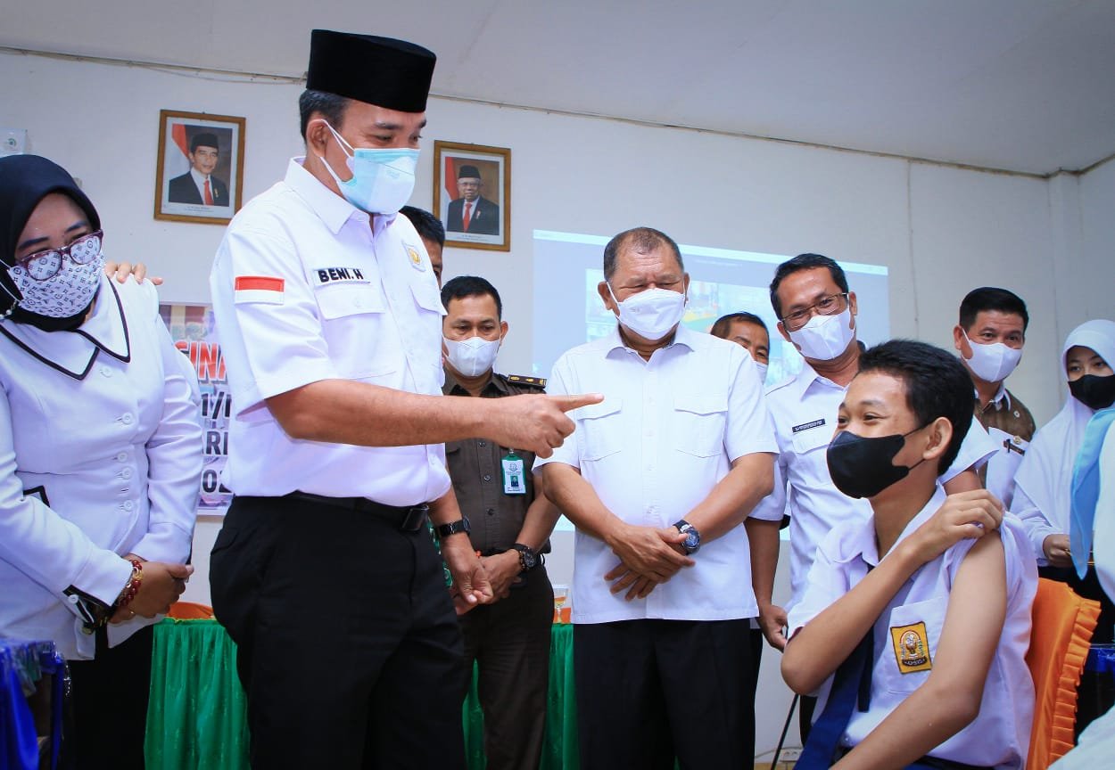 Senin (8/11/2021) Plt Bupati Muba Beni Hernedi meninjau langsung pelaksanaan Serbuan Vaksinasi COVID-19 dalam Rangka Hari Pahlawan yang menyasar kepada para Pelajar Sekolah tingkat SMP. Kegiatan ini di launching langsung oleh Danrem 044/Garuda Dempo (Gapo) Brigjen TNI M Naudi Nurdika secara virtual bertempat di SMP Negeri 1 Sekayu.