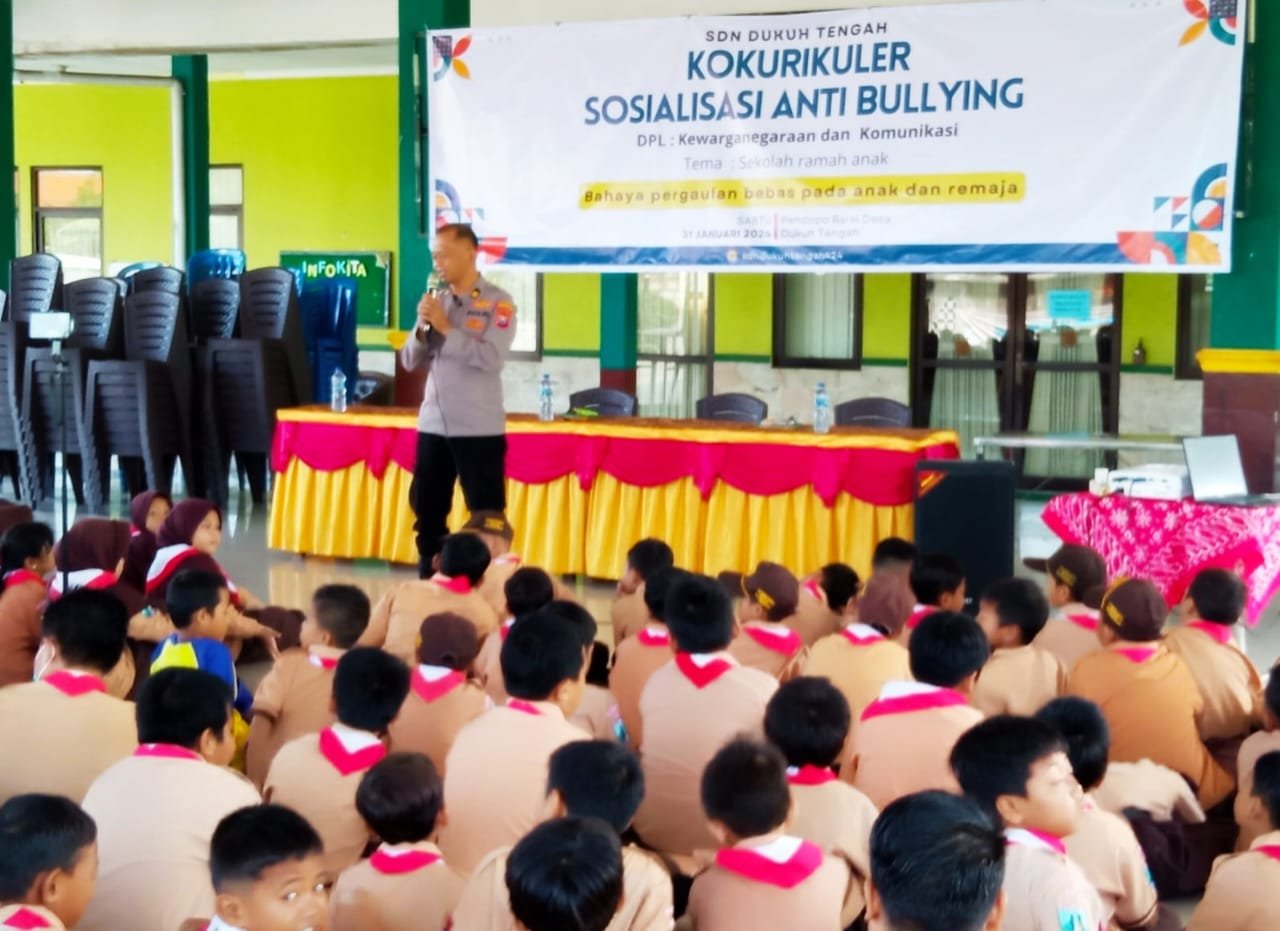 MATTANEWS.CO, SIDOARJO – Kanit Binmas Polsek Buduran, Iptu Sutarno, memberikan penyuluhan kepada siswa-siswi SD Negeri Dukuh Tengah, Kecamatan Buduran, Kabupaten Sidoarjo, Sabtu (31/1/2026). Kegiatan ini berlangsung di Pendopo Balai Desa Dukuh Tengah dan digelar dengan tema “Sekolah Ramah Anak, Bahaya Pergaulan Bebas pada Anak dan Remaja”.