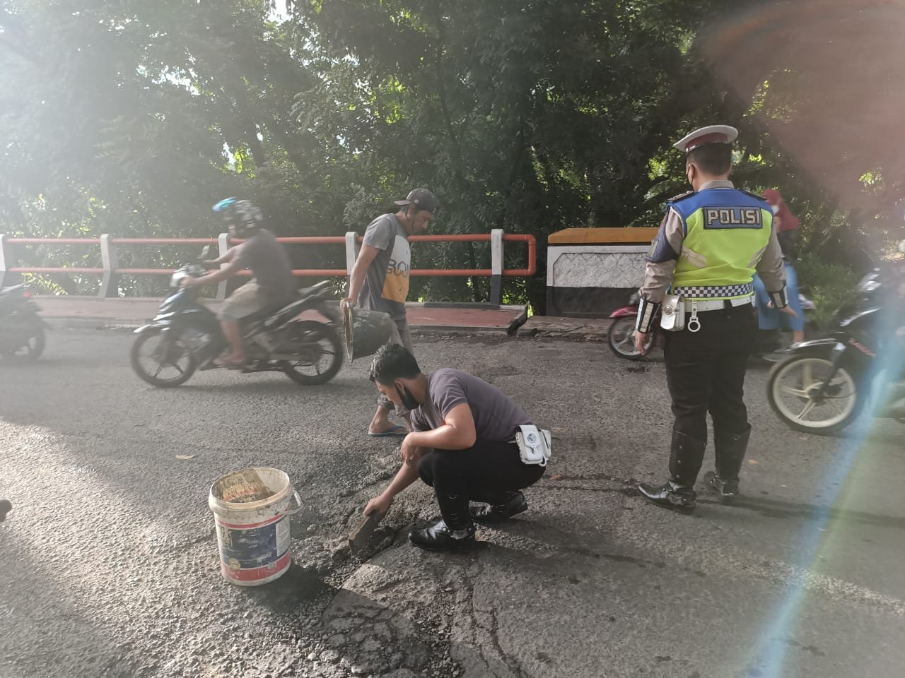 “Anggota kita melakukan penimbunan jalan-jalan yang berlobang dengan menggunakan semen cor di Jembatan Enim II yang yang merupakan Jembatan jalur lintas tengah,” kata Kasatlantas Polres Muara Enim, AKP Desy Ariyanti