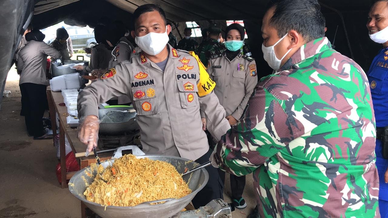 Kapolres Bangka Barat AKBP Dr. Muhammad Adenan bersama Dandim 0431 Letkol inf Agung Wahyu Perkasa, melakukan pengecekan di dapur umum di Kp. Tanjung Kecamatan Mentok Kabupaten Bangka Barat.