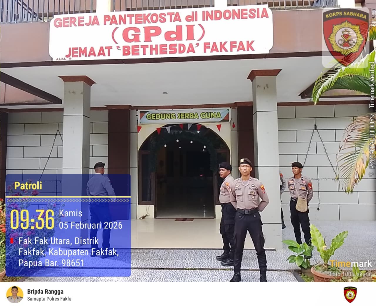 MATTANEWS.CO, FAKFAK – Polres Fakfak melaksanakan patroli serta pengamanan ibadah syukur di sejumlah gereja yang berada di wilayah Kota Fakfak. Patroli dilaksanakan dalam rangka memperingati Hari Ulang Tahun (HUT) Pekabaran Injil (PI) ke-171 di Tanah Papua Tahun 2026, yang diperingati pada Kamis, 5 Februari 2026,