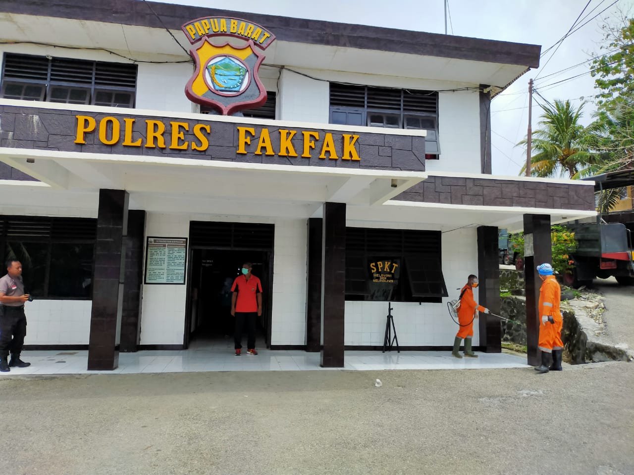 Dalam melakukan upaya dalam mencegah penyebaran Covid-19, Polres Fakfak melakukan penyemprotan disinfektan di setiap sudut Mapolres Fakfak, pada hari Jumat, 20 Maret 2020.