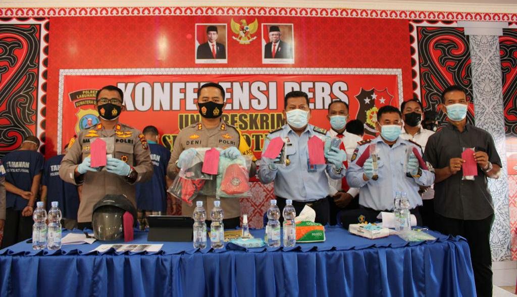 MATTANEWS.CO,LABUHANBATU- Kapolres Labuhanbatu AKBP Deni Kurniawan pimpin konferensi pers pengungkapan kasus pembakaran Rumah Dinas (Rumdis) Kepala Lembaga Pemasyarakatan (Kalapas) Kelas III Kota Pinang, di ruang lobi Polsek Kota Pinang, Senin (2/8/2021).