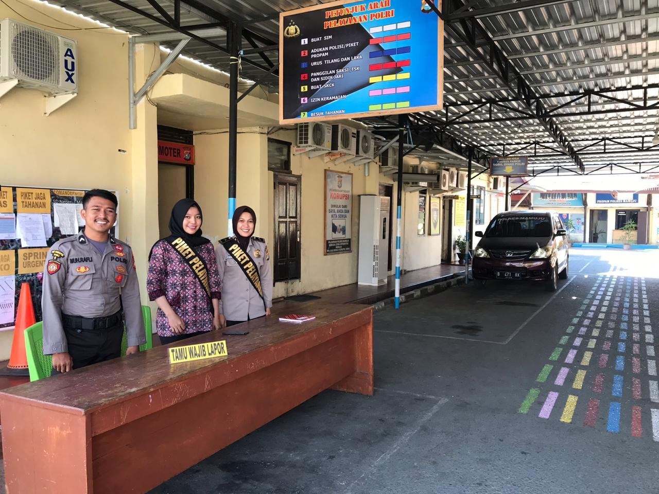 Seperti yang terlihat di area piket kantor Polres Mamuju ada 7 warna warni garis petunjuk arah pelayanan polri yang mengarah ke bagian-bagian pelayanan.