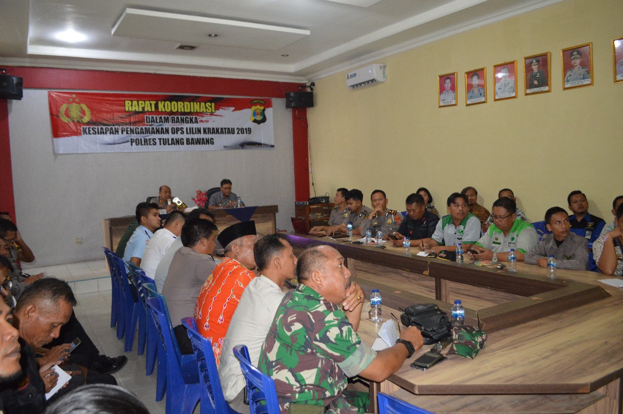 Polres Tulang Bawang menggelar rapat koordinasi (rakor) kesiapan pelaksanaan Operasi Lilin Krakatau 2019 di wilayah hukumnya. Kegiatan tersebut dilaksanakan Jumat (13/12/2019), sekira pukul 10.20 WIB, di ruang Rupatama Wira Satya Mapolres Tulang Bawang yang dipimpin langsung Kapolres Tulang Bawang AKBP Syaiful Wahyudi, SIK, MH.