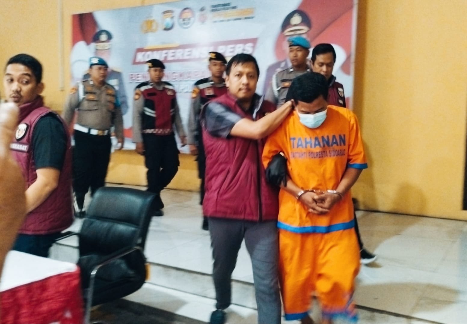 “Namun pada hubungan ketiga, situasi berubah tragis. Pelaku panik karena tidak membawa uang untuk membayar jasa korban. Dalam kondisi bingung, pelaku kemudian mencekik korban menggunakan tangan kanannya dan membekap wajah korban dengan bantal menggunakan tangan kiri. Tindakan itu dilakukan selama sekitar 10 menit hingga korban tidak sadarkan diri dan akhirnya meninggal dunia,” sambung Kapolresta Sidoarjo Kombes Pol. Christian Tobing.