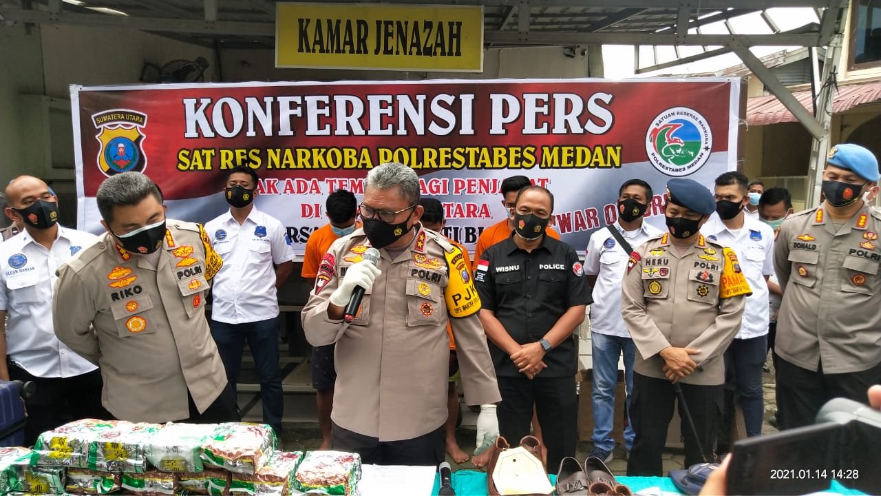 MATTANEWS.CO, MEDAN – Keberhasilan diawal tahun 2021 Sat Res Narkoba Polrestabes Medan berhasil ungkap peredaran narkotika jenis sabu jaringan Malaysia – Aceh – Pulau Jawa. Kapolda Sumatera Utara, Irjen Pol Martuani Sormin didampingi Kapolrestabes Medan Kombes Pol Riko Sunarko pimpin press release bertempat di depan ruang jenazah RS Bhayangkara TK ll Medan, Kamis (14/01/21).