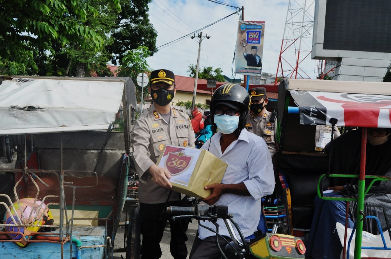 “Pemberian paket sembako itu, dengan cara patroli dialogis serta menghampiri para warga seperti tukang becak, tukang tampel ban serta lansia yang berada di sekitar Kota Kuala Simpang,”tutur Ari Lasta Irawan.