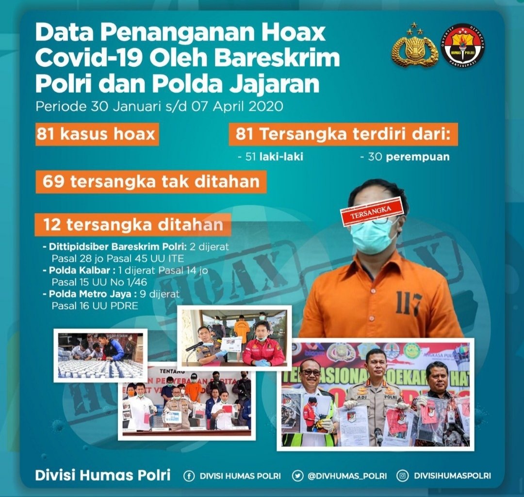 81 kasus hoax dengan 81 tersangka,” tulis akun Twitter resmi milik Divisi Humas Mabes Polri, Rabu (8/4/2020) yang dikutip mattanews.co.