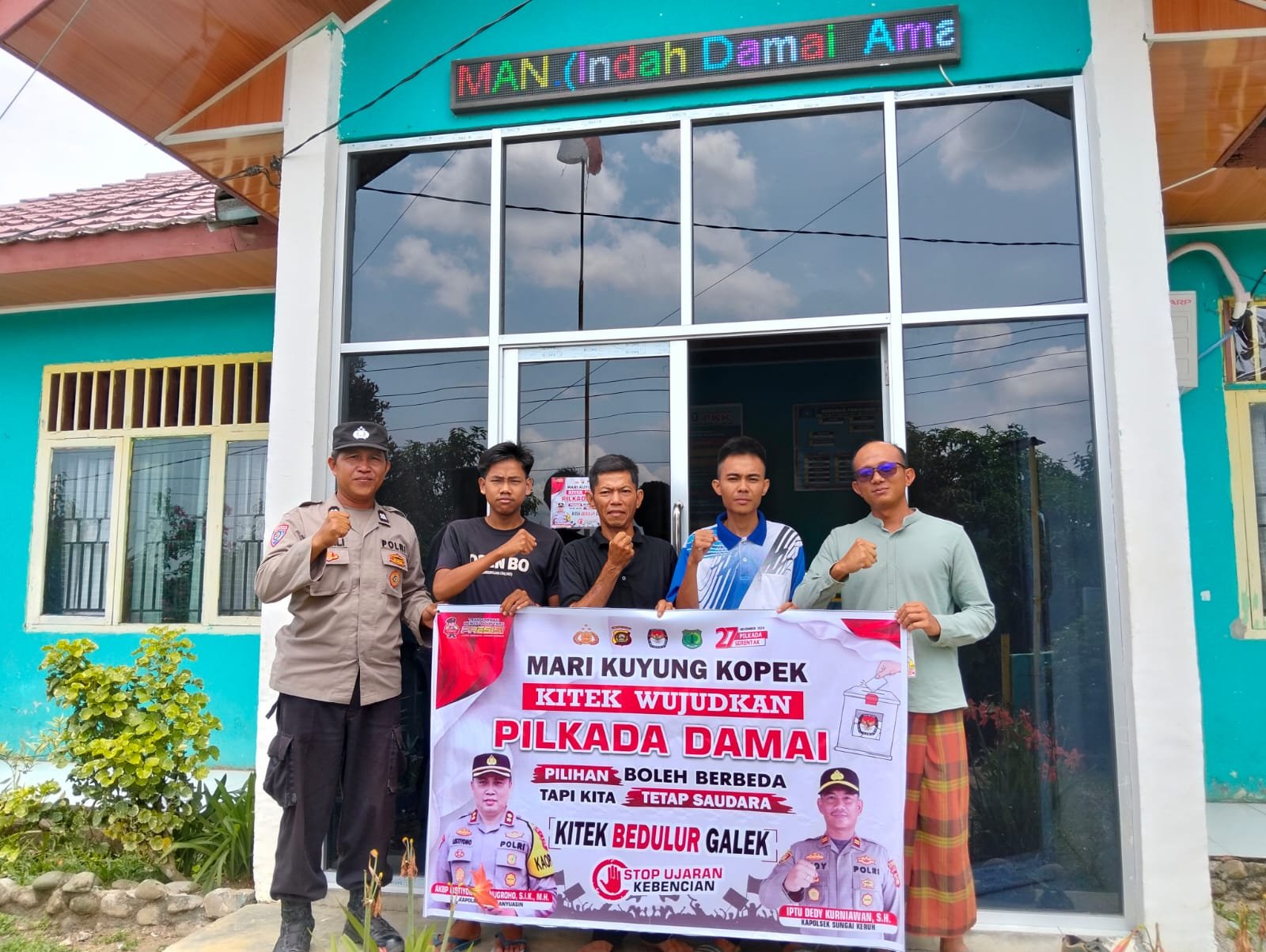 Giat sosialisasi Pilkada Damai dengan pemasangan stiker bertagline ‘Mari Kuyung Kopek Kitek Wujudkan Pilkada Damai’ dan tagline “Pilihan Boleh Berbeda Tapi Kita Tetap Saudara,Kitek Bedulur Galek” dan Deklarasi Pilkada Damai tersebut, dilakukan di Kantor Desa Jembatan Gantung Kecamatan Jirak Jaya dan Kantor Desa Rantau Sialang, Kecamatan Sungai Keruh, Kabupaten Musi Banyuasin, Rabu (23/10/2024).