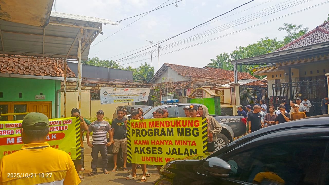 Dalam aksi damai yang berlangsung, warga membawa spanduk berisi aspirasi mereka, antara lain menolak penutupan akses jalan dari Perumahan Reyhan ke Dukuh Pengampon dan mendukung program MBG dengan catatan akses jalan tetap terbuka.
