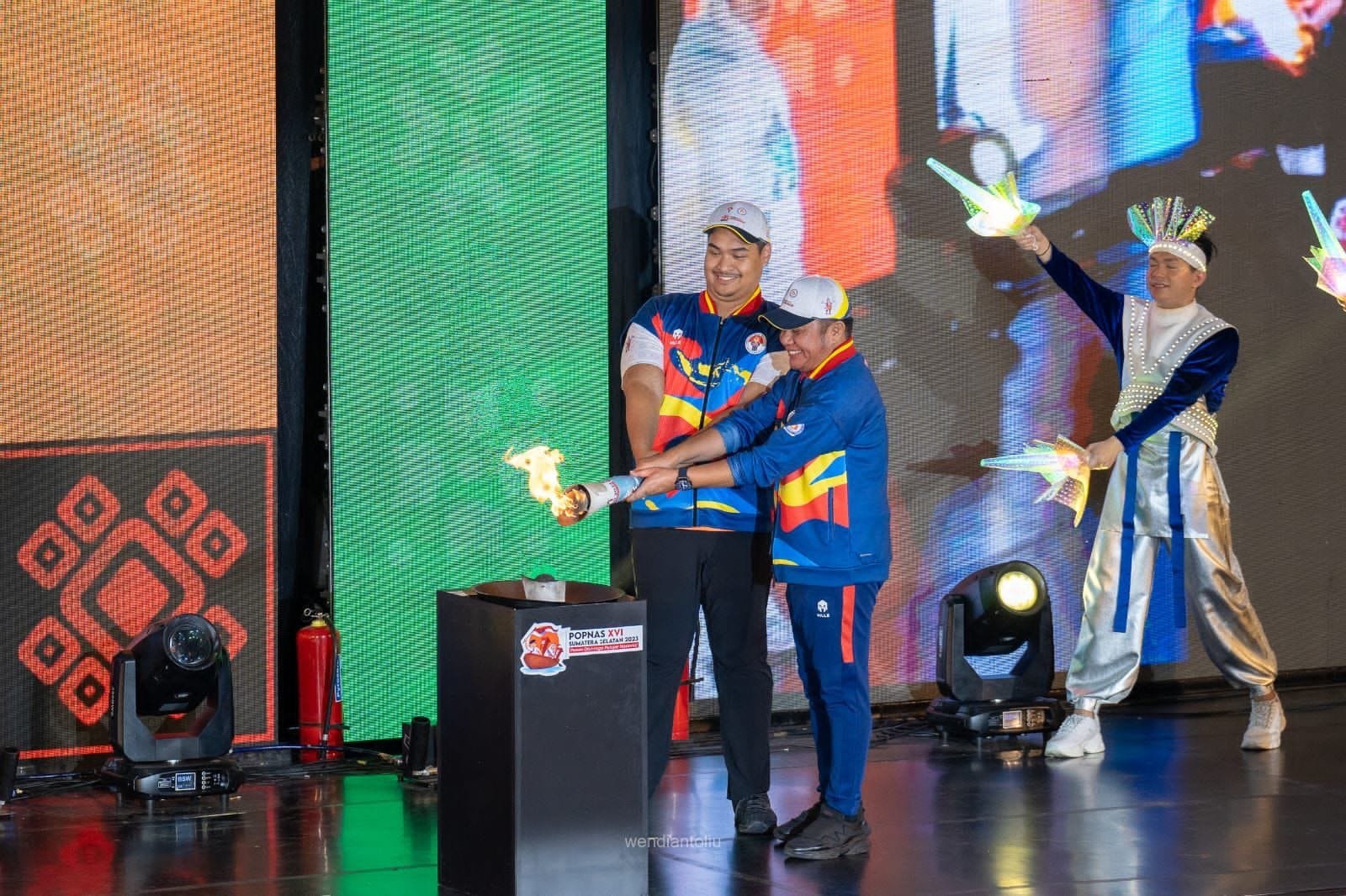POPNAS XVI dibuka resmi Menteri Pemuda dan Olahraga (Menpora), Dito Ariotedjo didampingi Gubernur Sumsel, Herman Deru yang ditandai dengan penyalaan obor dan defile kontingen di PSCC Palembang, Minggu (27/8) malam.
