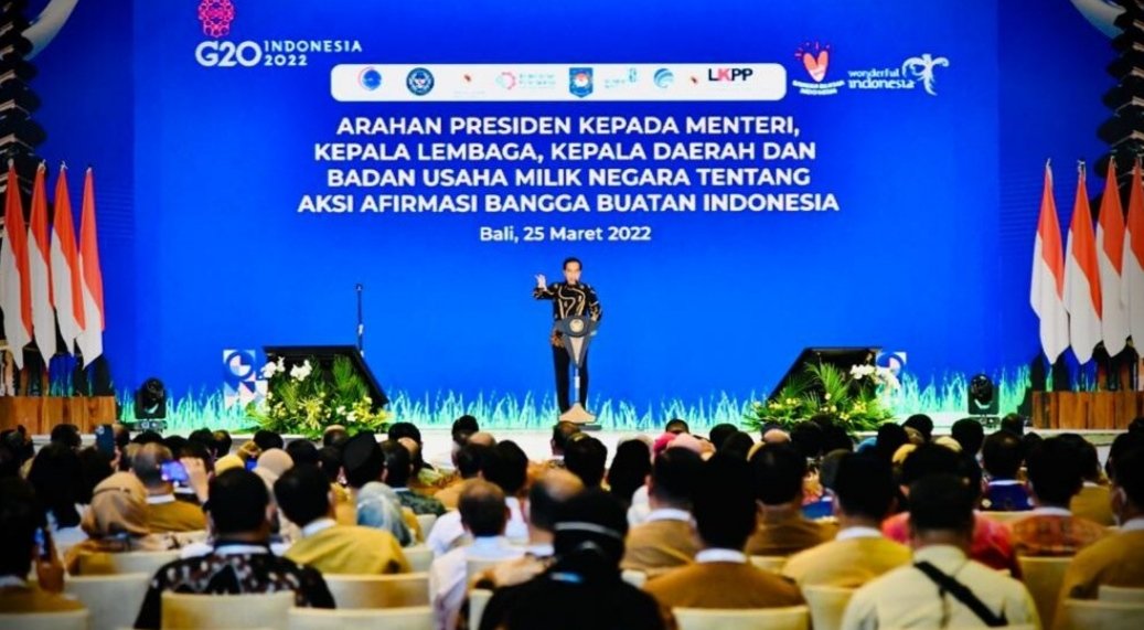Demikian disampaikan Presiden Joko Widodo saat memberikan pengarahan kepada para menteri, kepala lembaga, kepala daerah, dan BUMN tentang Aksi Afirmasi Bangga Buatan Indonesia, yang digelar di Hotel Grand Hyatt, Kabupaten Badung, Provinsi Bali, Jumat (25/3/2022).