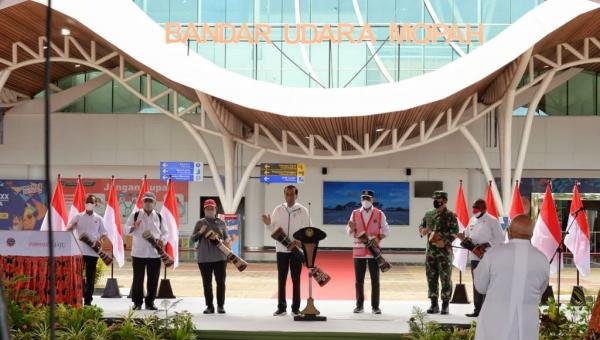 MATTANEWS.CO, JAKARTA- Presiden Joko Widodo meresmikan terminal baru Bandara Mopah di Kabupaten Merauke, Provinsi Papua, pada Minggu, 3 Oktober 2021. Pengembangan infrastruktur tersebut akan menghubungkan dan mempersatukan wilayah Indonesia sehingga mobilitas orang, barang, dan jasa menjadi lebih mudah.