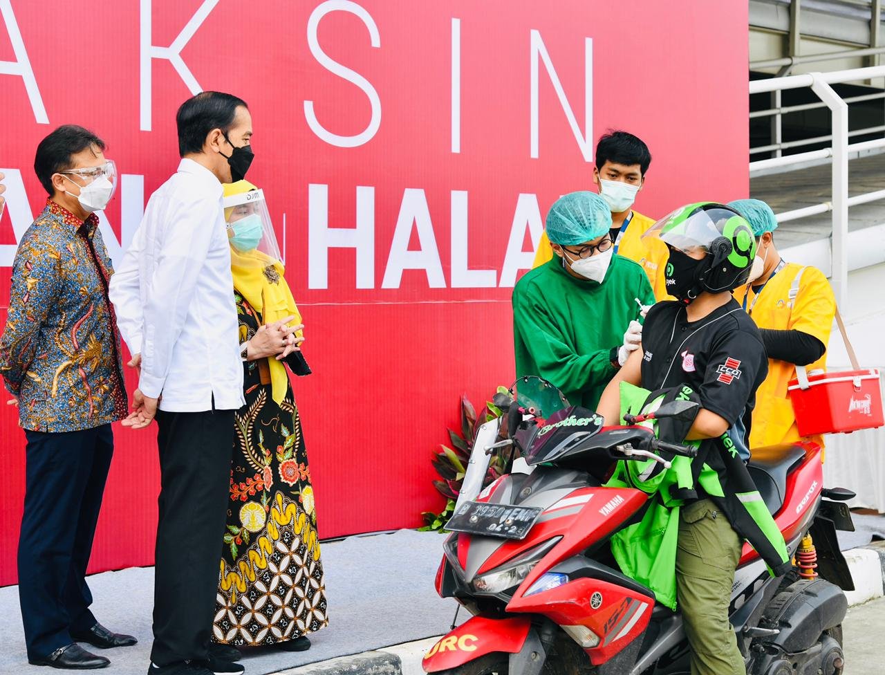 “Pagi hari ini saya meninjau pelaksanaan vaksinasi massal di Rumah Sakit Universitas Indonesia di Kota Depok yang dilakukan pada kurang lebih 1.500 para pendidik, lansia, dan juga pelayan publik. Tadi juga saya melihat langsung pelaksanaan vaksinasi drive thru untuk para pengemudi ojek, baik untuk roda dua, juga roda empat,” ujar Presiden usai peninjauan.
