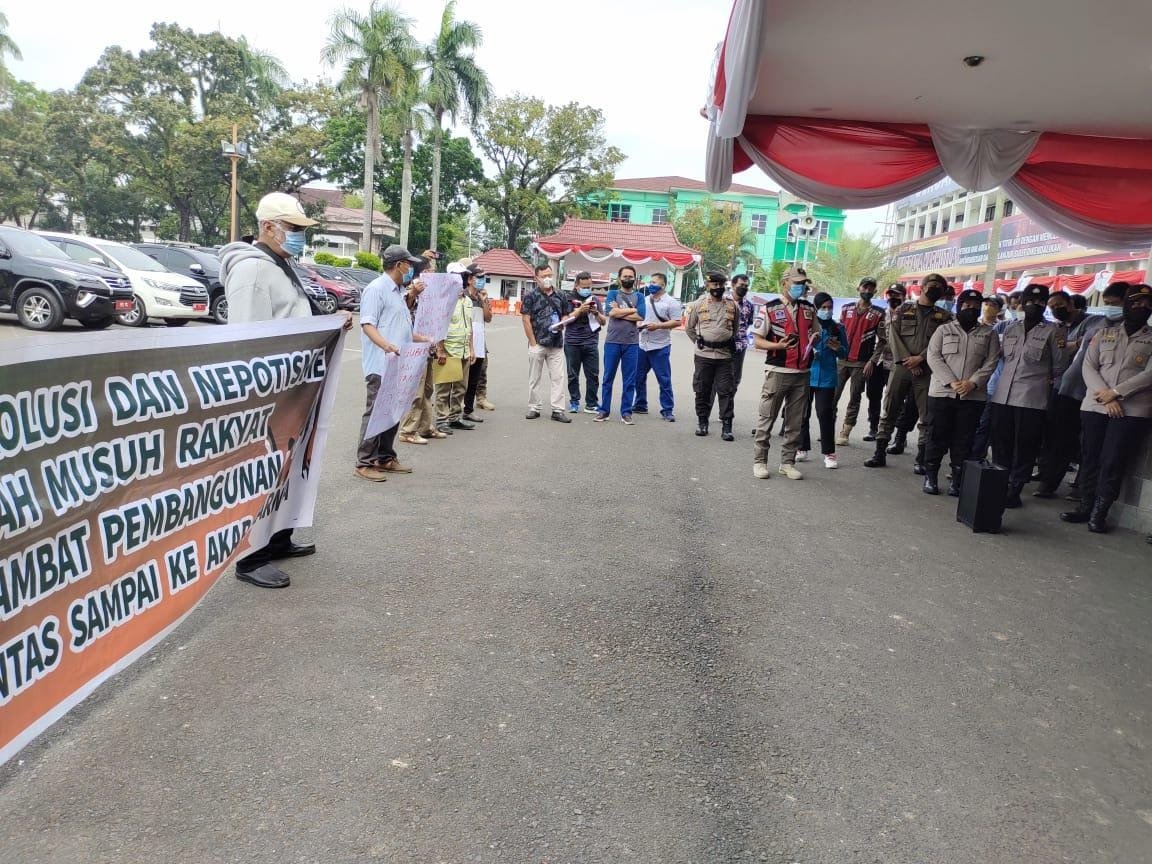 MATTANEWS.CO, PALEMBANG – Massa dari Presidium Lembaga Swadaya Masyarakat (LSM) Anti Korupsi Sumatera Selatan (Sumsel), menggelar aksi unjukrasa (unras), di Kantor Pemerintah Provinsi (Pemprov) Sumsel, Jumat (27/8/2021).