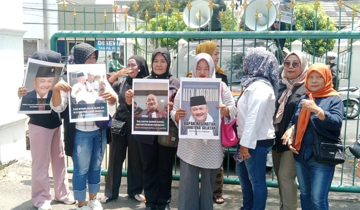 MATTANEWS.CO, PALEMBANG – Puluhan emak-emak dan aktivis Sumsel – Jakarta, menggelar aksi damai di depan Pengadilan Negeri (PN) Palembang, untuk memberi dukungan moril terhadap terdakwa Alex Noerdin matan Gubernur Sumsel, yang dikenal oleh masyarakat luas sebagai Bapak Pembangunan Sumsel, Kamis (30/10/2025).
