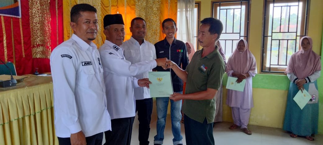 Tampak hadir dalam penyerahan Sertifikat tersebut, Eko Ihsan, Luki,Perwakilan dari BPN Tanah Datar, Sapril Wali Nagari Salimpaung, beserta Perangkat dan Wali Jorong, dan masyarakat penerima sertifikat tersebut.