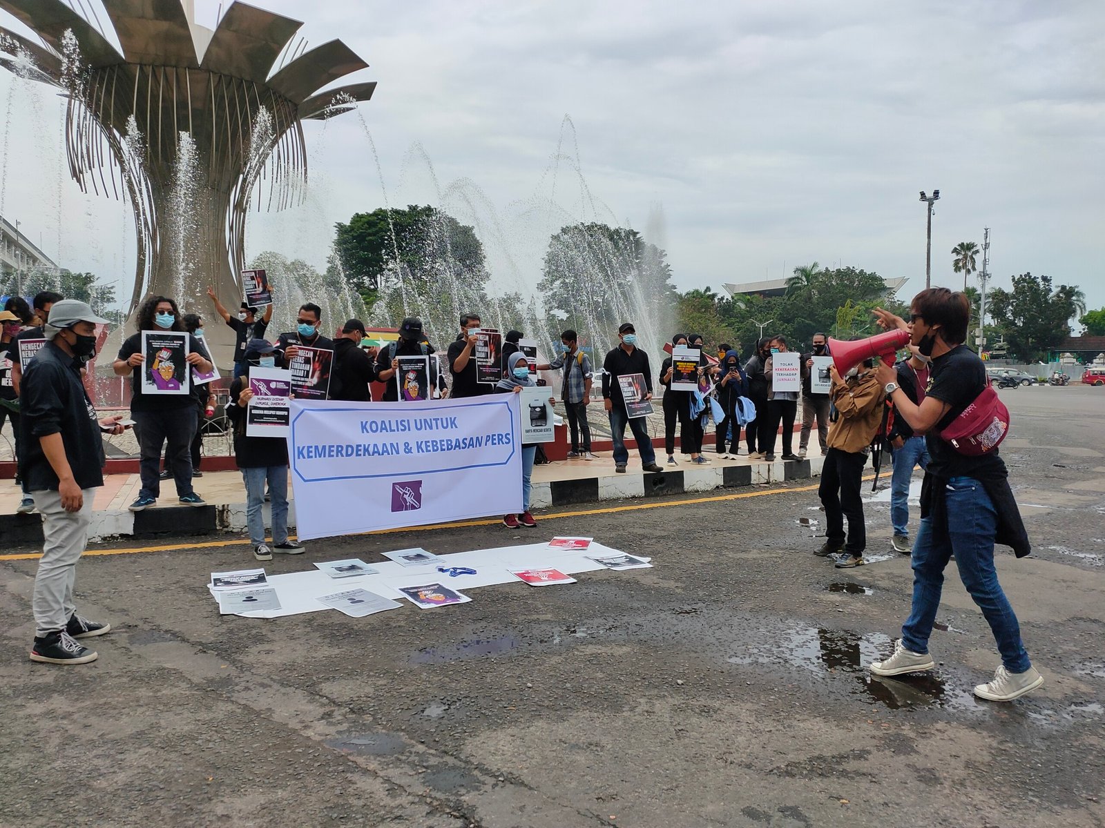 Aksi yang digelar di Bundaran Air Mancur (BAM) Masjid Agung Palembang, merupakan protes atas penganiayaan yang diduga dilakukan aparat keamanan di Surabaya, terhadap Nurhadi, Jurnalis Tempo.