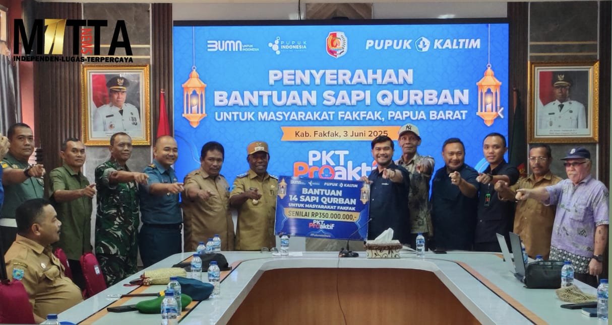 MATTANEWS.CO, FAKFAK – PT Pupuk Kalimantan Timur (Pupuk Kaltim) menyalurkan bantuan sapi kurban kepada masyarakat Kabupaten Fakfak, Provinsi Papua Barat, pada Idul Adha 1446 Hijriah, Selasa (3/6/2025).