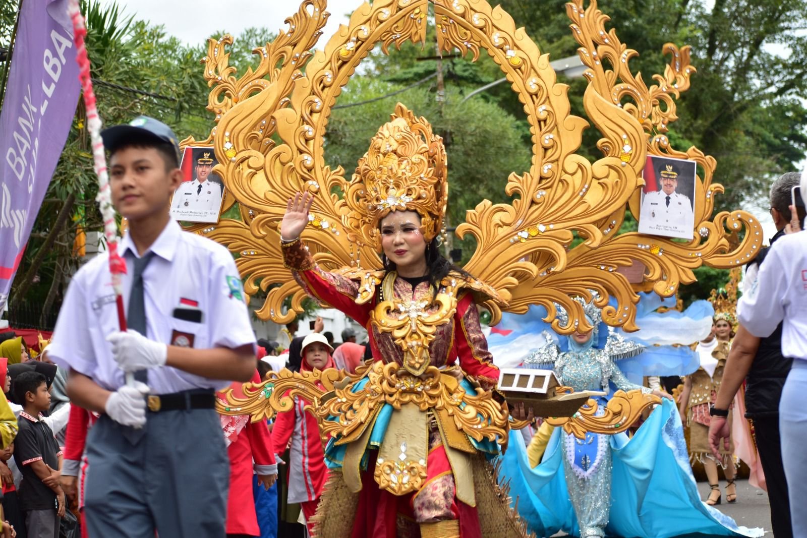 Dentuman drumband dari barisan TK dan PAUD menjadi tanda dimulainya parade. Kaki-kaki mungil itu melangkah dengan penuh semangat, meski sesekali tersenyum malu ketika penonton bersorak. Setelah itu, bendera merah putih raksasa membentang di udara, diikuti barisan kontingen pelajar SMP, SMA, hingga mahasiswa yang menampilkan busana daerah dari berbagai penjuru Nusantara.