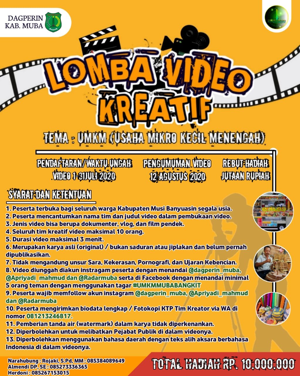 Kali ini, support tersebut diberikan kepada seluruh pelaku UMKM di Muba, dimana Pemkab Muba melalui Dinas Perdagangan dan Perindustrian Muba bekerjasama dengan Komunitas Sosial Media Radar Muba serta di inisiasi Sekda Muba Drs H Apriyadi MSi menggelar lomba pembuatan video kreatif bertema Pemulihan UMKM (Usaha Mikro Kecil Menengah) Muba Di Era New Normal.