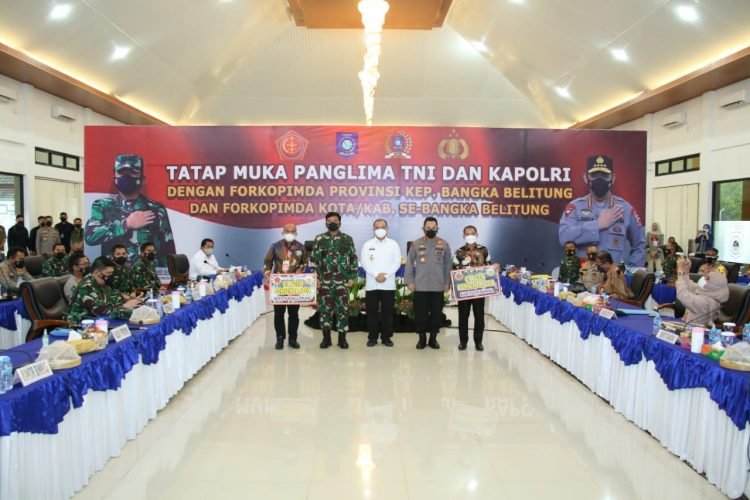 MATTANEWS.CO, JAKARTA– Dengan Panglima TNI Marsekal Hadi Tjahjanto, Kapolri Jenderal Listyo Sigit Prabowo melakukan rapat evaluasi penanganan dan pengendalian Covid-19 bersama Forkompimda Provinsi Kepulauan Bangka Belitung, Sabtu (14/8/2021).