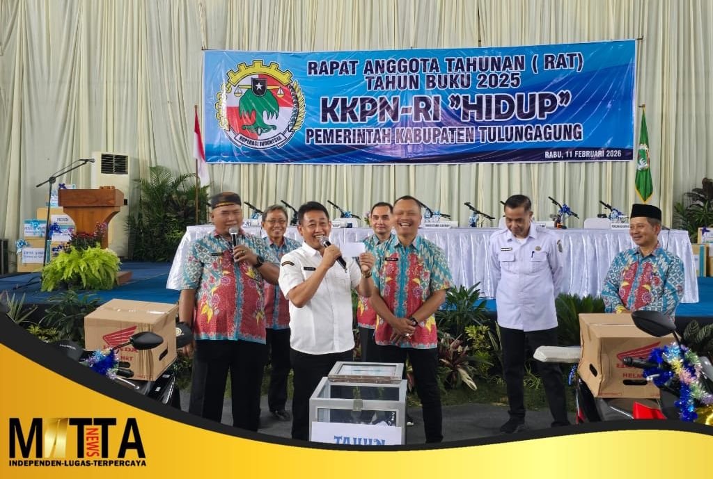 MATTANEWS.CO,TULUNGAGUNG – Komitmen memperkuat koperasi sebagai pilar ekonomi kerakyatan kembali ditegaskan Pemerintah Kabupaten Tulungagung. Dalam Rapat Anggota Tahunan (RAT) Tahun Buku 2025 KKPN-RI “HIDUP” yang digelar di GOR Lembu Peteng, Rabu (11/2/2026), Bupati Tulungagung H. Gatut Sunu Wibowo, S.E., M.E., melalui Pj Sekda Tulungagung Soeroto, S.Sos., M.M., mendorong pengurus koperasi melakukan ekspansi usaha secara terukur, profesional, dan berorientasi pada kesejahteraan anggota.