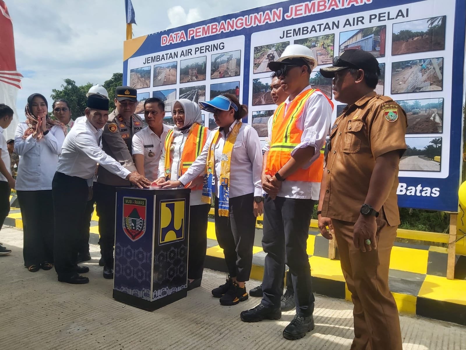Setelah menyapa, Bupati Mura menandatangani prasasti dan langsung melakukan pemotongan Pita serta melepas balon terbang tanda jembatan Air Pering SP.7 Kota Baru dengan bentang 35 merer dan lebar 7 meter serta Jembatan Air Pelai SP.6 Raksa Budi telah diresmikan, dan sekarang sudah bisa dilalui kendaraan roda dua maupun roda empat.