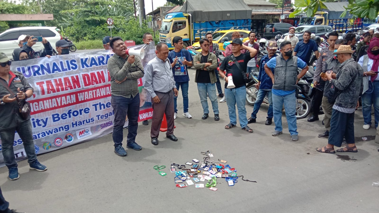 MATTANEWS.CO, KARAWANG – Ratusan wartawan yang tergabung dalam Forum Jurnalis Karawang (FJK) kembali menggelar aksi unjukrasa di depan Polres Karawang, guna mempertayakan kenerja aparat kepolisian, Polres Karawang, tentang belum ditangkapnya pelaku penculikan dan pengeroyokan salah satu wartawan, Senin (7/11/2022) siang.