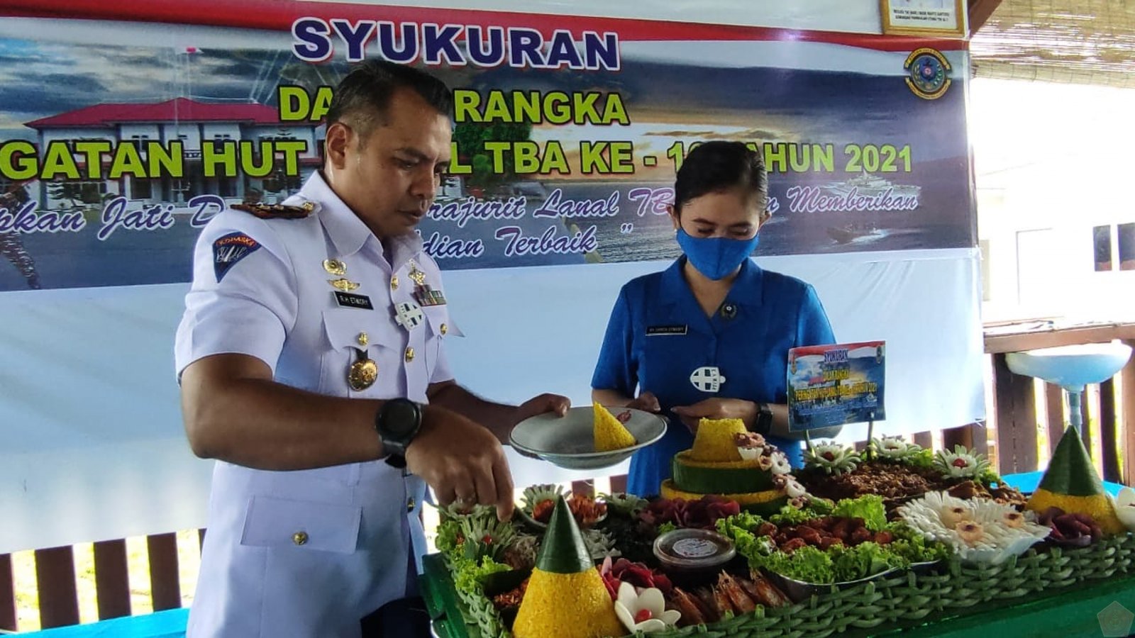 Pemotongan tumpeng sebagai tanda syukur kepada Tuhan YME oleh Danlanal TBA didampingi Ketua Jalasenastri Cabang 7 Korcab I Ny. Shinta Etwiory, yang diberikan kepada prajurit sebentar lagi memasuki Peltu Mar Alfian.