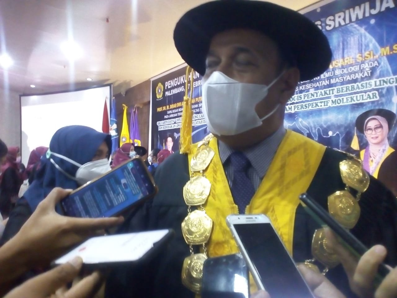 “Kendala dalam meraih gelar Profesor sendiri terletak pada pembuatan journal,” jelasnya, usai kegiatan Pengukuhan guru besar Unsri Prof Dr Yuanita Windusari, SSi MSi sebagai guru besar pada fakultas kesehatan masyarakat dan Prof Dr Ir Dinar Dwi Anugerah Putranto MSPJ sebagai guru besar fakultas teknik di Fakultas Hukum Unsri, Rabu (17/2/2021).