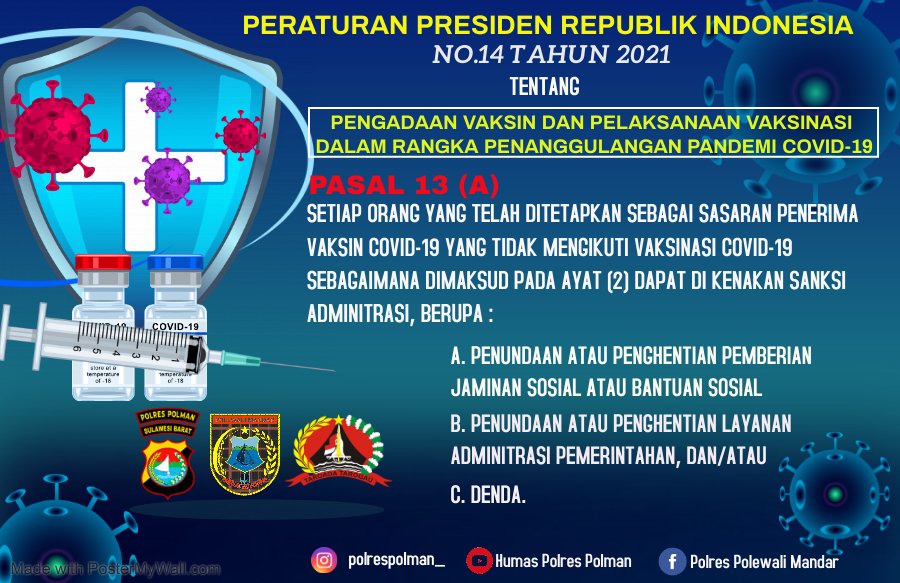 Ardi juga mengajak seluruh masyarat di Kabupaten Polman agar mengikuti vaksinasi yang di selengarakan oleh pemerintah, dan bagi masyarat yang tidak mengikuti vaksinasi Covid-19 akan di kenakan sanksi sesuai dengan pasal 13 (A). “Setiap Orang Yang Telah Ditetapkan Sebagai Sasaran Penerima Vaksin Covid-19 yang tidak mengikuti vaksinasi Covid-19 Sebagaimana Dimaksud Pada Ayat (2) dapat di Kenkaan Sanksi Adminitrasi, Berupa Penundaan Atau Penghentian Pemberian Jaminan Sosial Atau Bantuan Sosial, Penundaan Atau Penghentian Layanan Admitrasi Pemerintah dan Denda,” Pungkas Kapolres Polman AKBP Ardi Sutriono.