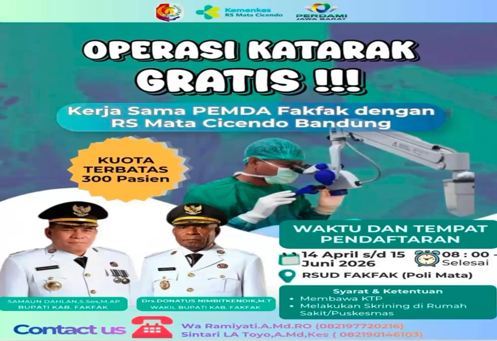 MATTANEWSS.CO, FAKFAK – Rumah Sakit Umum Daerah (RSUD) Fakfak, membuka pendaftaran operasi katarak gratis bagi masyarakat Fakfak dengan kuota 300 orang. Pendaftaran dibuka sejak tanggal 14 april – 15 Juni 2026 di RDUD bagian poli mata.