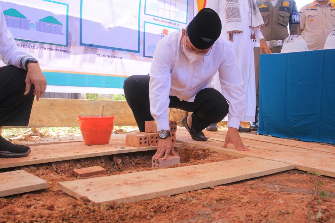 Dengan disaksikan, para pengurus masjid, bersama tokoh masyarakat sekitar, Bupati DRA terlihat menuangkan langsung semen dan meletakkan batu bata pembangunan menara dan tempat wudhu tersebut.