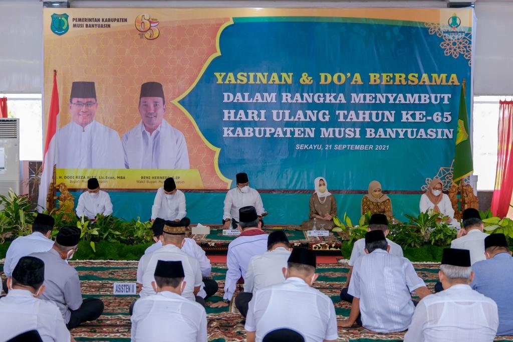 Kegiatan yasinan dan doa bersama yang digelar dalam rangka menyambut Hari Ulang Tahun (HUT) Kabupaten Musi Banyuasin (Muba) ke-65, acara berlangsung hikmat dan dilaksanakan sesuai protokol kesehatan COVID-19. Bertempat di Pendopoan Griya Bumi Serasan Sekate, Selasa (21/9/2021).