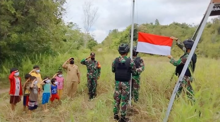 Komandan Satgas Pamtas RI-Malaysia, Letkol Inf Andri Suratman menyampaikan anggota Satgas Pamtas memasang bendera merah putih di depan rumah warga, Rumah Panjang Janting Dusun Bunut Lalau dan Dusun Sebindang, Kapuas Hulu.