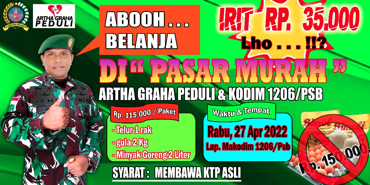 Bazar murah yang dilaksanakan oleh Kodim 1206/Psb ini bekerja sama dengan Artha Graha. Adapun paket sembako yaitu telor 1 rak, gula pasir 2 kg dan minyak goreng 2 liter, dengan dijual Rp 115.000. Jadi hemat Rp 35.000 dari harga aslinya. Total yang disediakan sebanyak 400 paket.