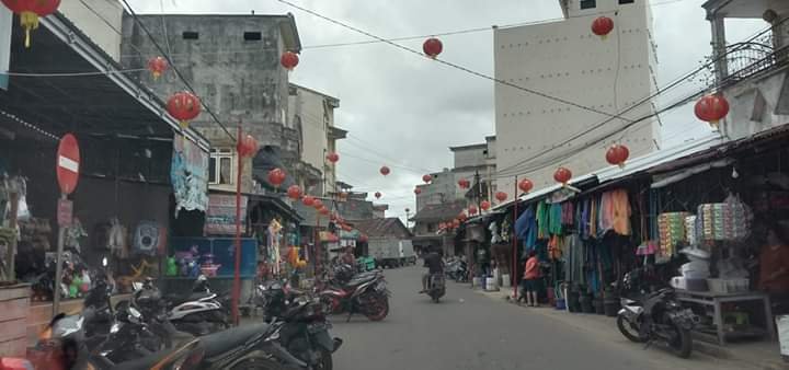 Nampak ratusan lampion sudah terpasang menghiasi Pasar Parit Tiga. Mulai dari simpang lampu merah, pertigaan Pasar Parit Tiga hingga Jalan Raya Kimjung.