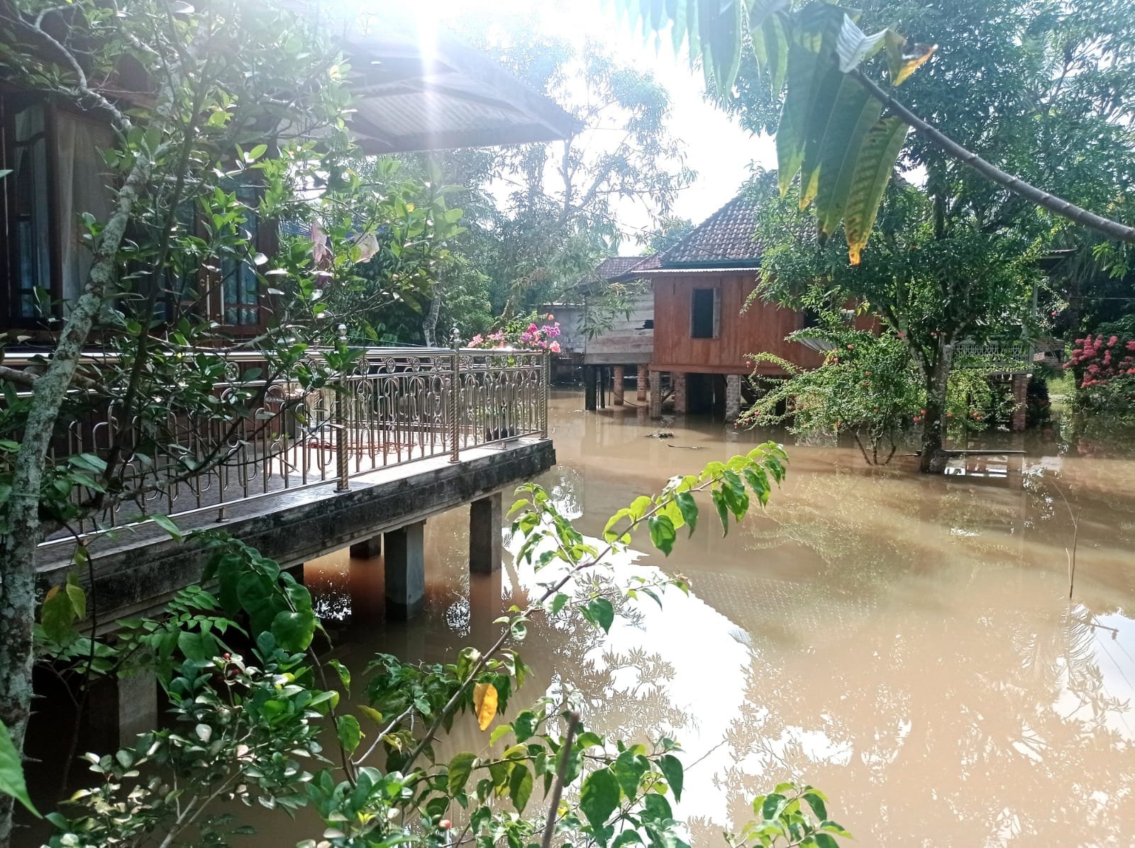 Berlatar Rumah Panggung (rumah adat. red) walau ketinggian air mencapai 1,5 meter tapi tidak menghawatirkan genangan itu bakal membanjiri tempat tinggal warga, hanya batas halaman rumah.