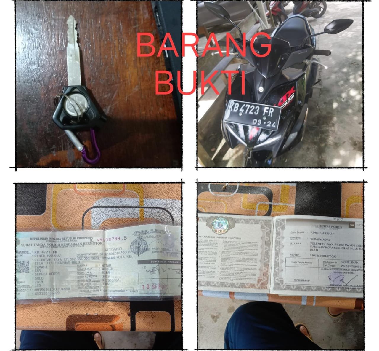 Kasat Reskrim Polres Kapuas Hulu Iptu Rinto Sihombing mengungkapkan, pihaknya berhasil mengamankan tersangka J (33 tahun) berikut dengan barang bukti diantaranya 1 unit sepeda motor Yamaha Aerox, 1 buah BPKB atas nama pelapor, 1 buah STNK atas nama pelapor 1 buah kunci kontak motor Yamaha Aerox