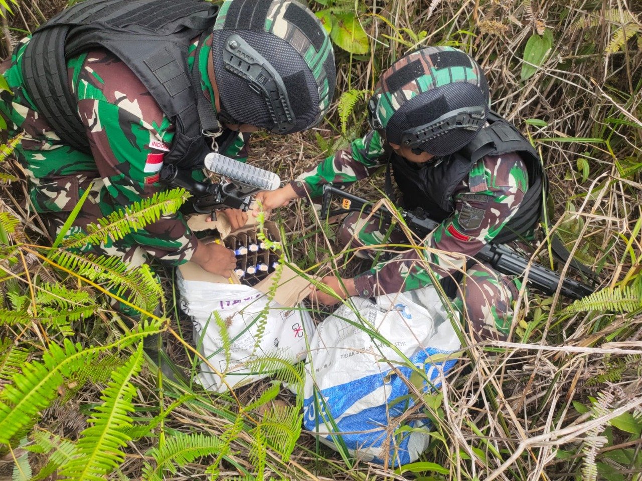 MATTANEWS.CO, KAPUAS HULU– Satgas Pamtas RI-Malaysia Yonarmed 19/105 Trk Bogani berhasil mengamankan 2 karung yang berisikan 2 dus minuman keras benson sebanyak 96 Botol yang diduga akan diselundupkan ke Indonesia di jalur tidak resmi Bukit Bayi Desa Badau, Kecamatan Nanga Badau, Kabupaten Kapuas Hulu, Kalimantan Barat, Minggu (30/10/2022) kemarin.