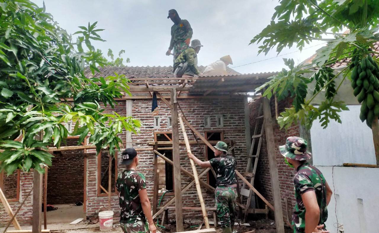 Tampak sejumlah anggota Satgas TMMD dengan dibantu warga tengah kebut perehaban rumah Bu Ulil di Desa Sendang Kulon, Kecamatan Kangkung.